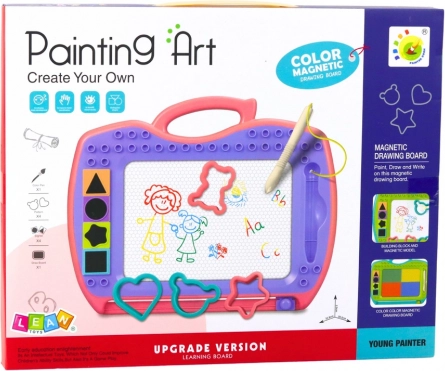 Set obsahuje čtyři různé razítka a čtyři šablony pro obkreslení, které podporují rozvoj kreativity a umožňují snadné první kroky v kreslení. Barevné magnetické pole zaujme pozornost dítěte a kompaktní rozměry spolu s praktickým úchytem umožňují snadné přenášení tabulky kamkoliv - na procházku, do auta nebo na cestu.