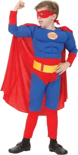 Kostým Super hrdina pro děti 5-9 let. Ideální pro karnevaly a dětské party. Obsahuje kombinézu, masku a plášť.