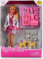 Staňte se veterinářkou s panenkou Lucy a jejími rozkošnými pejsky. Kompletní sada s bílým pláštěm a doplňky pro vyšetření zvířecích pacientů.