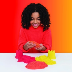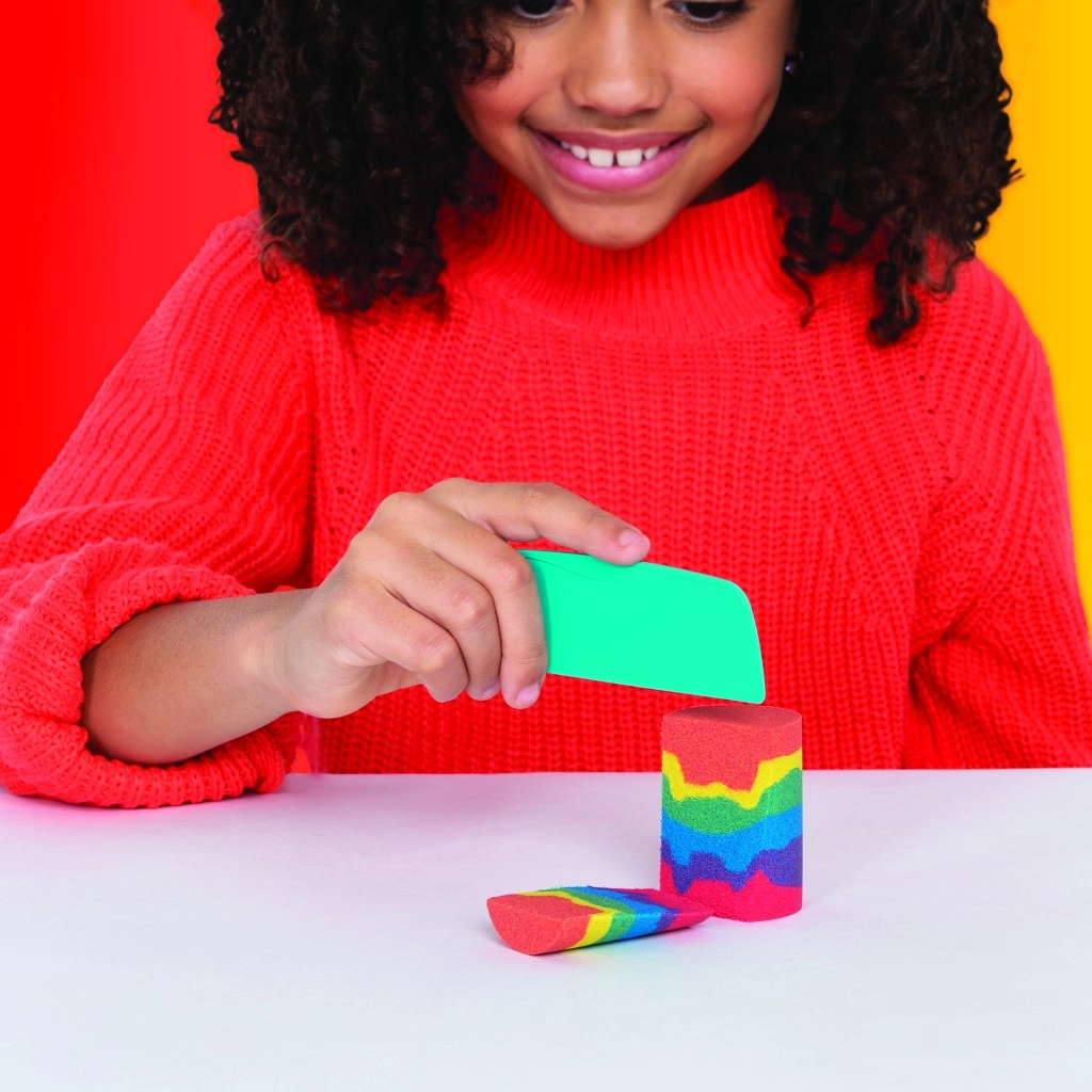Tato sada kombinuje ikonický písek Kinetic Sand s praktickými nástroji pro řezání, míchání a formování. Vytvářejte realistické duhy, vrstvěte barvy a stavte pestré hrady – písek drží tvar, nelepí se a je příjemný na dotek.