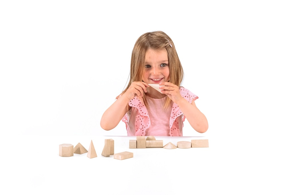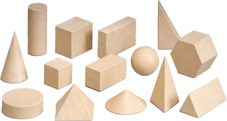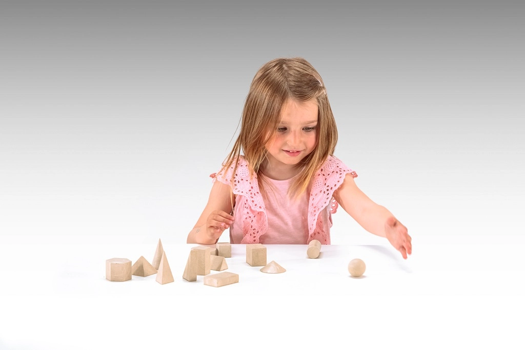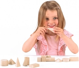 Tato dřevěná sada obsahuje 14 různých geometrických těles, které slouží jako ideální nástroj pro rané učení geometrie. Děti se naučí rozpoznávat tvary jako krychle, kvádr, hranol, válec, jehlan, kužel a koule.