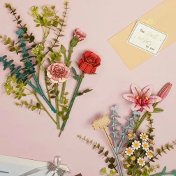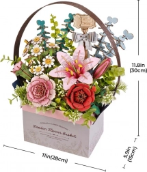 Balení obsahuje všechny potřebné dílky: dřevěný košík, růžovou lilii, červenou růži, heřmánek, růžový karafiát, eukalyptus a dekorativní rostliny. Tato sada je dodávána v nesloženém stavu s podrobným návodem k sestavení.