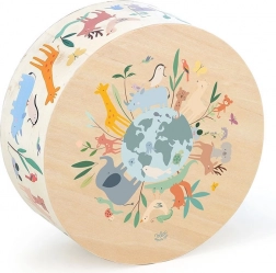 Objevte kouzlo hudby s Vilac Dřevěným Cajónem Zvířata světa, který zaujme nejen designem od talentované umělkyně Sarah Betz, ale i všestranným využitím: