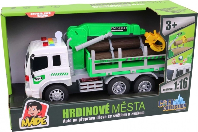 Auto na přepravu dřeva se zvedacím ramenem a světelnými efekty