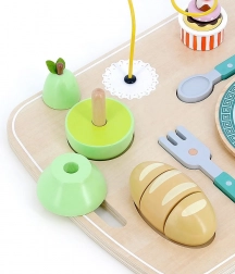 Tento dřevěný podnos s aktivitami od značky Vilac nabízí dětem možnost skvělého hraní při rozvoji jemné motoriky a koordinace. Obsahuje stohovatelnou hrušku, krájecí bochník chleba a zmrzlinu s pohyblivými dílky. Ideální pro dětské ruce.