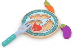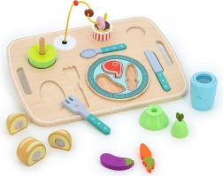 Vilac Dřevěný aktivity podnos s jídlem je ideální volbou pro první dobrodružství ve "stolování". Podporuje nezávislost a rozvoj jemné motoriky. Díky svým veselým barvám a příjemným tvarům je vhodný i pro ty nejmenší.
