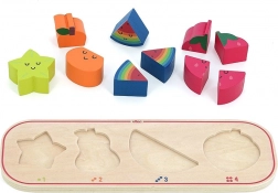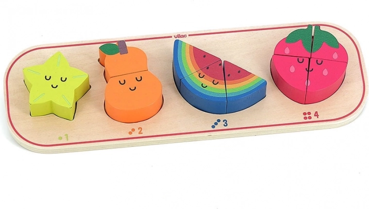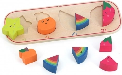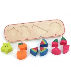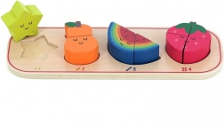 Toto zábavné a edukativní puzzle přináší dětem radost z objevování a učení prostřednictvím hry. Každý dílek ovoce, jako je žlutá karambola, oranžová hruška, barevný meloun a červená jahoda, přichází v různém počtu dílků k vkládání do dřevěné podložky. Děti se učí rozpoznávat tvary, barvy a odpovídající čísla, což přirozeně rozvíjí jejich jemnou motoriku a koordinaci ruka-oko.