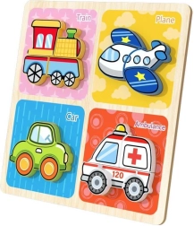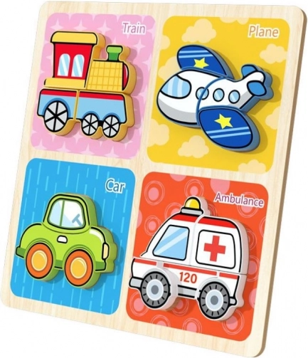 Dřevěné puzzle o rozměrech 30 x 30 cm je vybaveno obrázky čtyř různých dopravních prostředků, které přidají hře na atraktivitě a vzdělávacím prvku. Děti si s těmito puzzly nejen hrají, ale také procvičují své jemné motorické schopnosti a logické myšlení, což je ideální pro děti ve věku od 3 let.