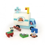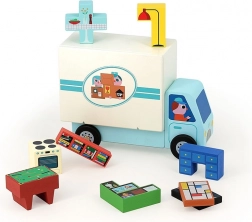 Set obsahuje dřevěné stěhovací auto a 19 kusů nábytkových kostek, ideální pro samostatnou i společnou hru s rodinou.