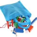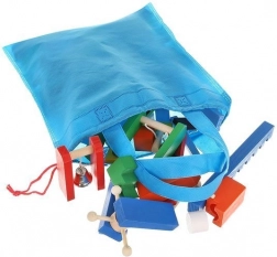 Tři síťované vaky se stahováním usnadňují přenášení a ukládání. Dřevěné kostky mají hladké hrany a jsou barveny bezpečnými barvami pro klidnou hru dětí od 3 let.