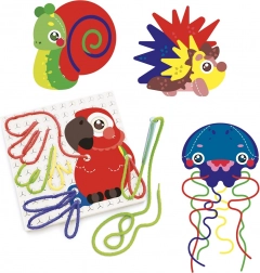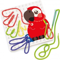 Obsahuje odolnou provlékací desku s motivem papouška, čtyři pevné zvířecí kartony a osm barevných tkaniček se zakončením pro snadnou manipulaci. Sada je ideální pro domácí tvoření i mateřské školy a podporuje současně motoriku, trénink úchopu a vizuální vnímání.