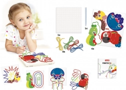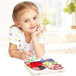Speciální provlékací pero umožní dětem bezpečně a pohodlně vést tkaničku otvory desky. Otvor tkaničku po vytažení pera pevně podrží, takže vzory drží tvar.