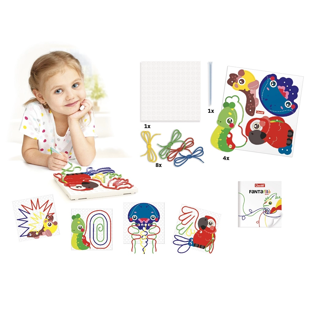 Sada Fantafilò Zoo je hravý způsob, jak děti naučit trpělivosti, přesnosti a rozvíjet jejich fantazii. Díky provlékacímu peru se tkaničky jednoduše zasouvají a po nadzvednutí zůstávají bezpečně zachycené. Děti mohou vytvářet vlastní vzory nebo se inspirovat přiloženými předlohami.