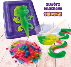 Přineste do hry tvořivost a zábavu s Zestavem Slumi Science - Antistresovým Chameleonem! S tímto balíčkem vaše dítě může snadno a rychle vytvořit fantastického chameleona, který mění barvy. Postup je jednoduchý: smíchejte magické tekutiny, přidejte barevně měnící prášek, nalijte směs do formy a sledujte, jak váš chameleon ožívá.