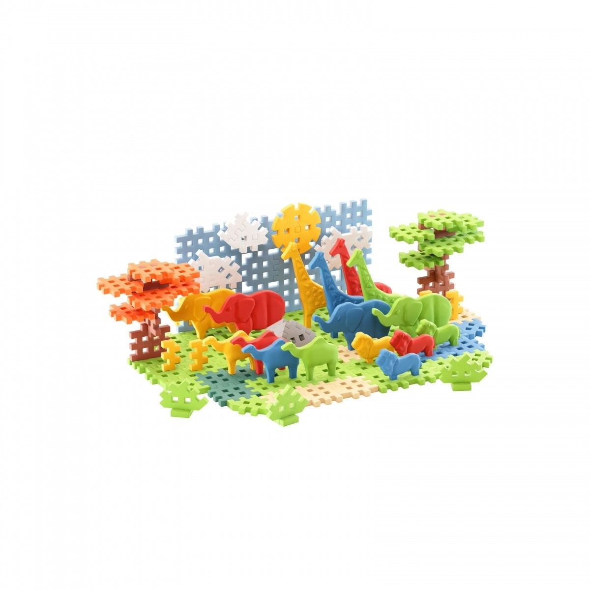 Díky 100 prvkům, včetně 16 jedinečných figurek zvířat, mohou malí průzkumníci znovu vytvořit přirozené prostředí obývané lvy, slony, žirafami, zebrami a mnoha dalšími africkými zvířaty. Přiložené kostky Mini Waffle různých tvarů umožňují stavbu charakteristických stromů savany, jako jsou akácie a mopanové stromy, stejně jako další prvky pozadí, které obohacují svět hry.