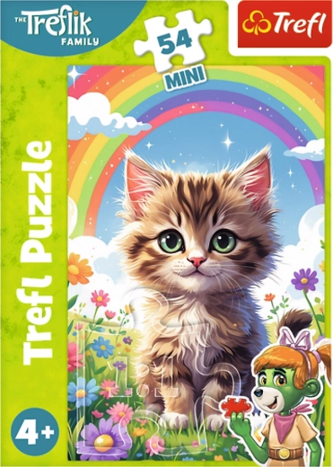 Mini-Puzzle Treflíci kotě s 54 dílky, ideální pro děti, velikost dílků 2,2 cm, rozměry 13 x 20 cm.