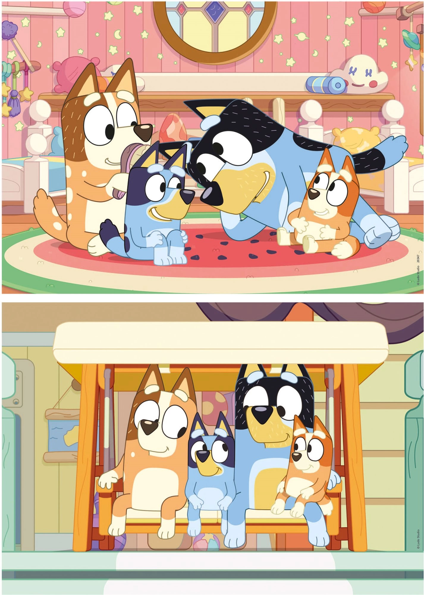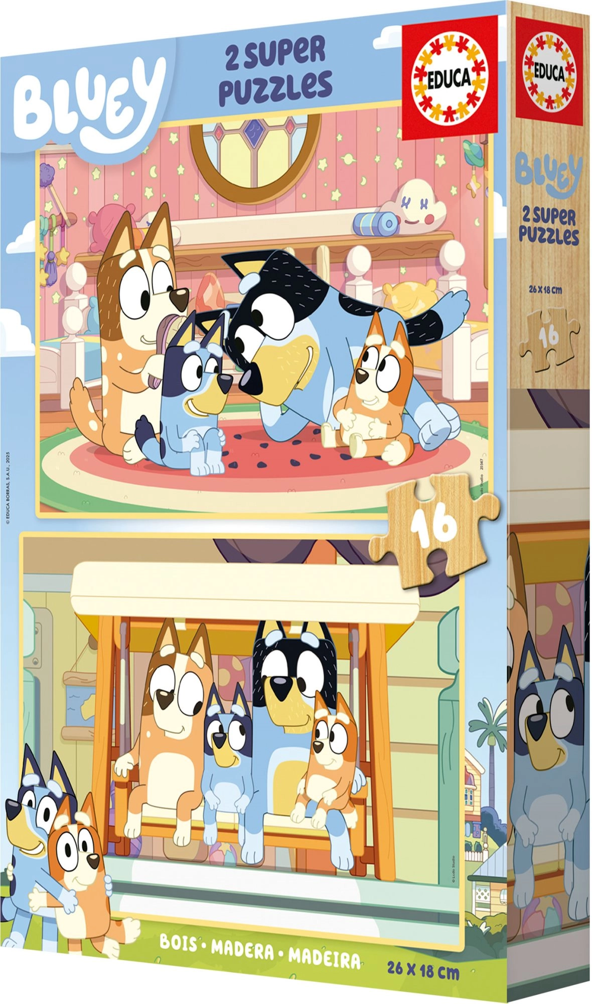 Objevte úžasný svět Bluey s těmito kvalitními dřevěnými puzzly od EDUCA. Každá krabička obsahuje dvě puzzle, které jsou: