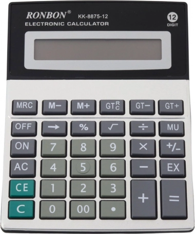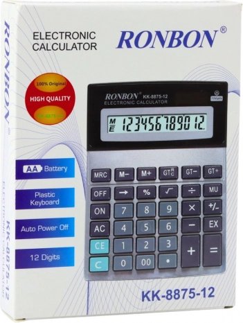 Kalkulačka Ronbon KK-8875-12 nabízí všechny důležité funkce potřebné pro každodenní výpočty. Kromě základních matematických operací umožňuje i procentuální výpočty, odmocniny, paměťové funkce (MRC, M+, M-), funkci Grand Total (GT) pro sumování a markup (MU) pro výpočet marže.