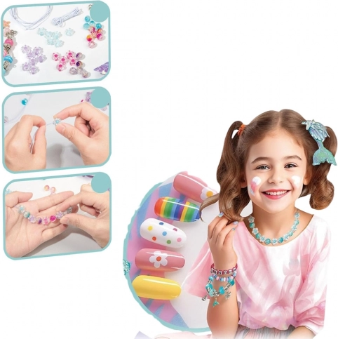 Sada je navržena pro dívky, které milují třpytivé ozdoby, oceánské barvy a vlastní výrobu doplňků. Díky různorodým prvkům – od barevných korálků, přes nail art samolepky, až po ozdobný hřeben s tvarem ocasní ploutve – si děti mohou vytvořit vlastní kolekci šperků v mořském stylu.