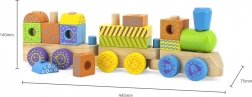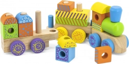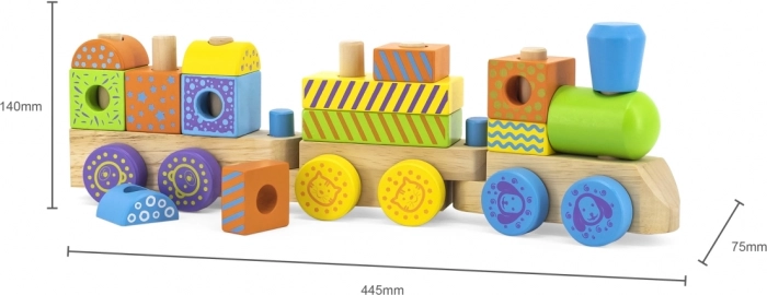 Tento kvalitní dřevěný vláček je tvořen několika vagónky s kolíky, na které děti skládají pestré geometrické kostky. Kombinuje skládání, tahání i stavění, takže podněcuje představivost a trénuje koordinaci oko–ruka. Pečlivě opracované dřevo a netoxické barvy zajišťují bezpečnost i odolnost při každodenní hře.