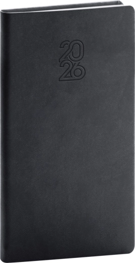 Elegantní kapesní diář v černé barvě pro rok 2026 nabízí týdenní rozvrh s mnoha jazykovými mutacemi, praktické kalendárium a prostor pro poznámky.