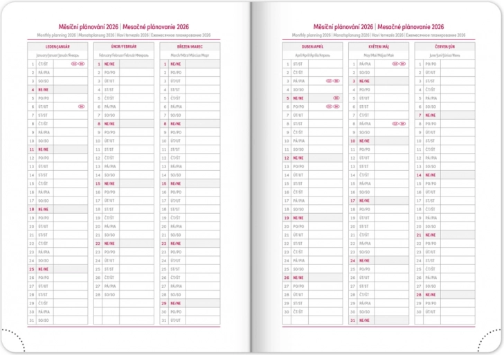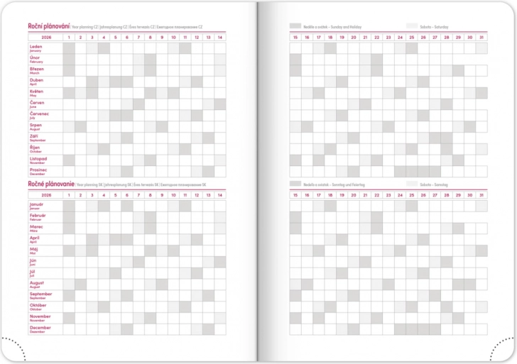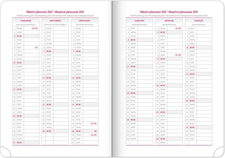 - Měsíční a roční plánovací kalendář pro roky 2026–2027