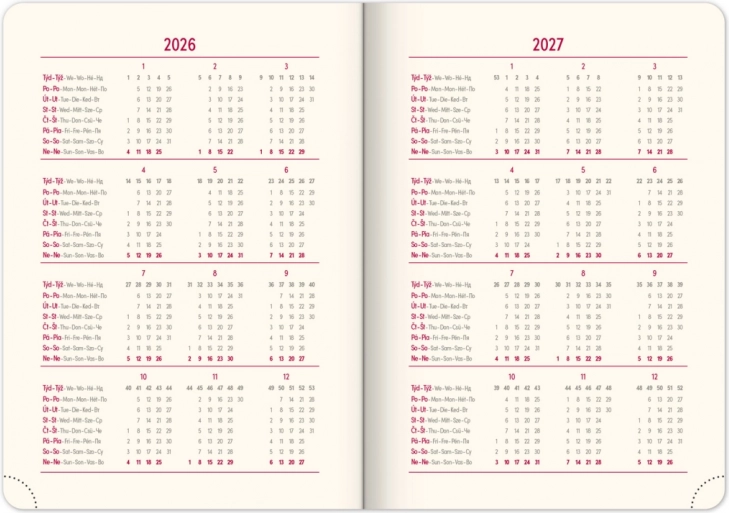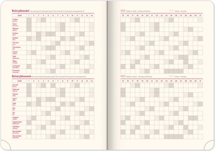 Tento diář je perfektní volbou pro ty, kteří hledají kombinaci stylu a funkcionality. Je vybaven zakulacenými rohy, poutkem na tužku a elastickou gumičkou pro lepší uzavření. Diář má týdenní rozvrh a obsahuje česko-slovenské kalendárium spolu s doplňkovými jazyky, jako jsou angličtina, němčina, maďarština a ruština.