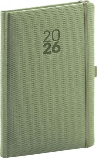 Elegantní Týdenní diář Diamante 2026 v olivové barvě s jemnou strukturou připomínající výbrus diamantu, ideální pro osobní i pracovní plánování.