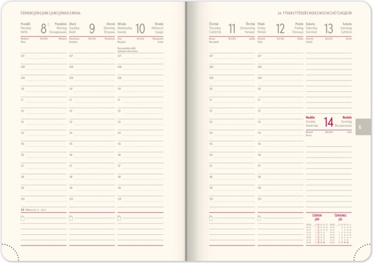 Tento týdenní diář kombinuje styl a funkčnost díky modro-zlatému designu s metalickým povrchem a ražbou letopočtu. Disponuje praktickými prvky, jako jsou zakulacené rohy, poutko na tužku a elastická gumička, které zajišťují pohodlné používání. Diář zahrnuje rozvrh s česko-slovenským kalendáriem a také s dalšími jazyky jako je angličtina, němčina, maďarština a ruština.