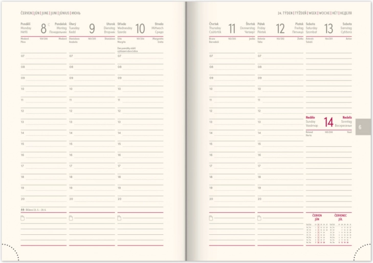 - Týdenní rozložení s česko-slovenským kalendáriem a doplňkovými jazyky: angličtina, němčina, maďarština a ruština.