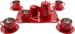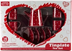 Krásná červená plechová sada čajového nádobí s motivem srdíček, ideální pro všechny malé kuchařky, které chtějí zkrášlit svou kuchyňku.
