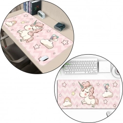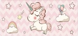 Podložka je vyrobena z měkké, ale odolné gumy, která zajišťuje stabilní přilnutí k povrchu stolu a zabraňuje posouvání. Vrchní vrstva materiálu je příjemná na dotek a odolná proti oděru. Růžový design s motivy jednorožce, mraků a hvězdiček přináší pohádkovou atmosféru a oživuje prostor.