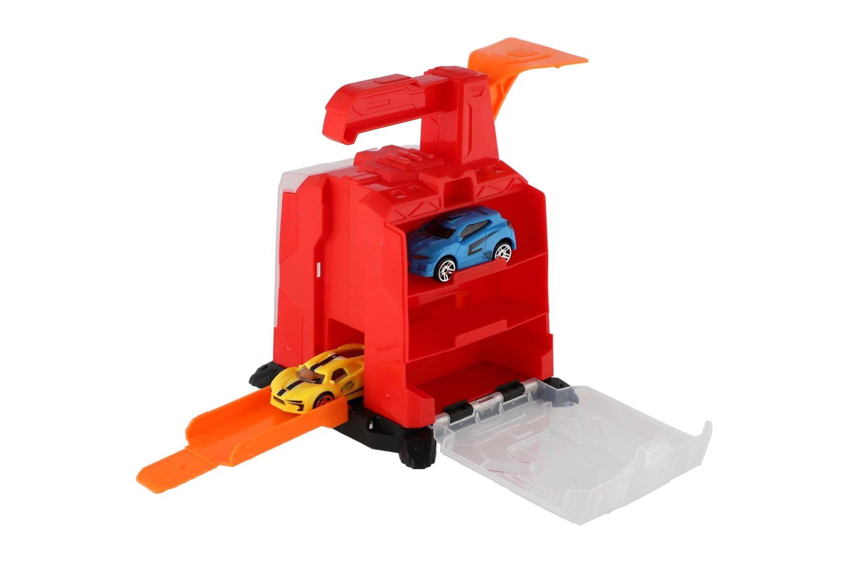 - Vystřelovací mechanismus, sklápěcí rampy, úložiště pro autíčka