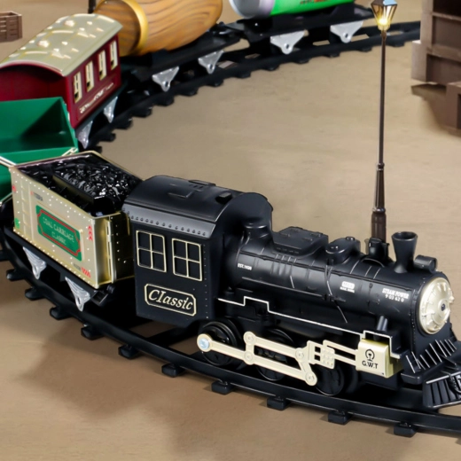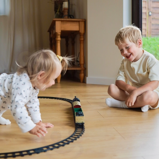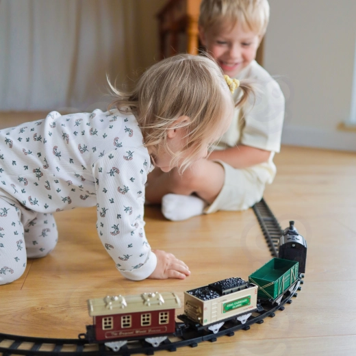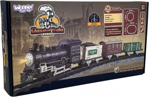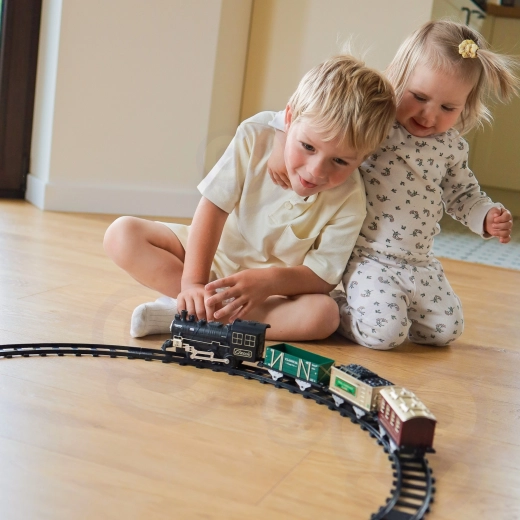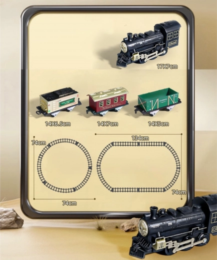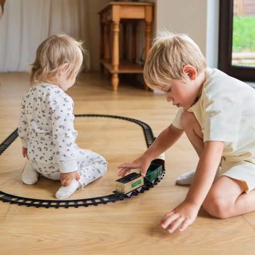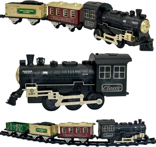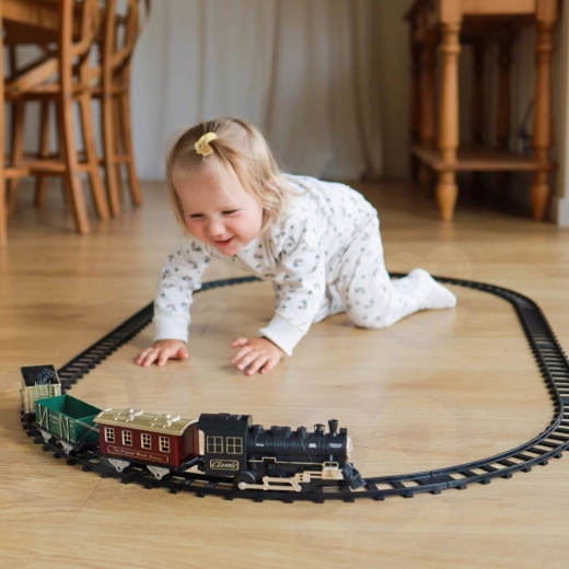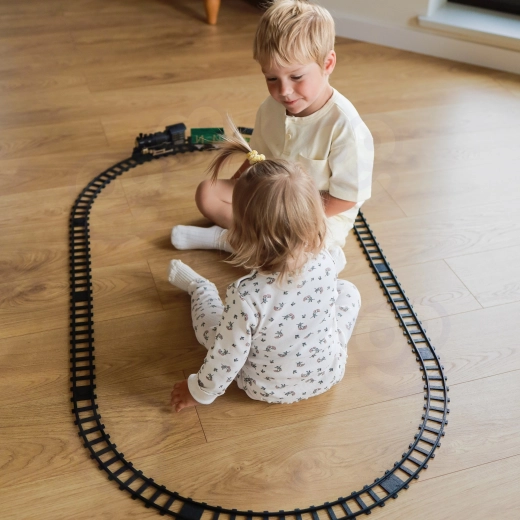 Tato tradiční parní souprava přináší dětem autentický zážitek z jízdy vlakem. Lokomotiva má svítící reflektor a realistické zvuky, které umocňují atmosféru hry. Koleje se jednoduše zacvakávají, takže během chvilky postavíte okruh o průměru 74 cm nebo ovál 134 × 74 cm.
