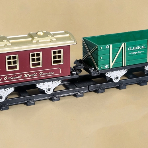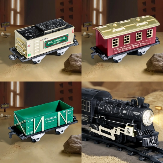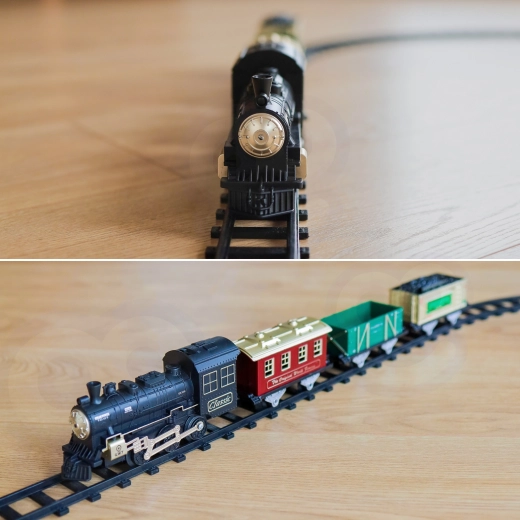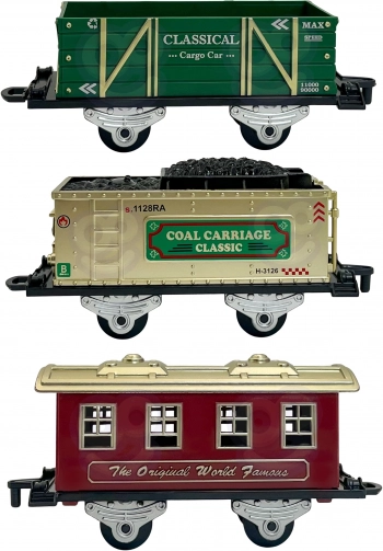 - lokomotiva se světlem a zvuky, pasažérský vůz, uhlový vůz, nákladní vagón, 10 dílů kolejí (4 rovné, 6 zakřivených)