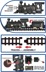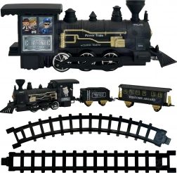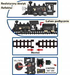• Kompletní set: lokomotiva se světlem a zvuky, uhlový vůz, osobní vagón, 8 zakřivených a 4 rovné koleje