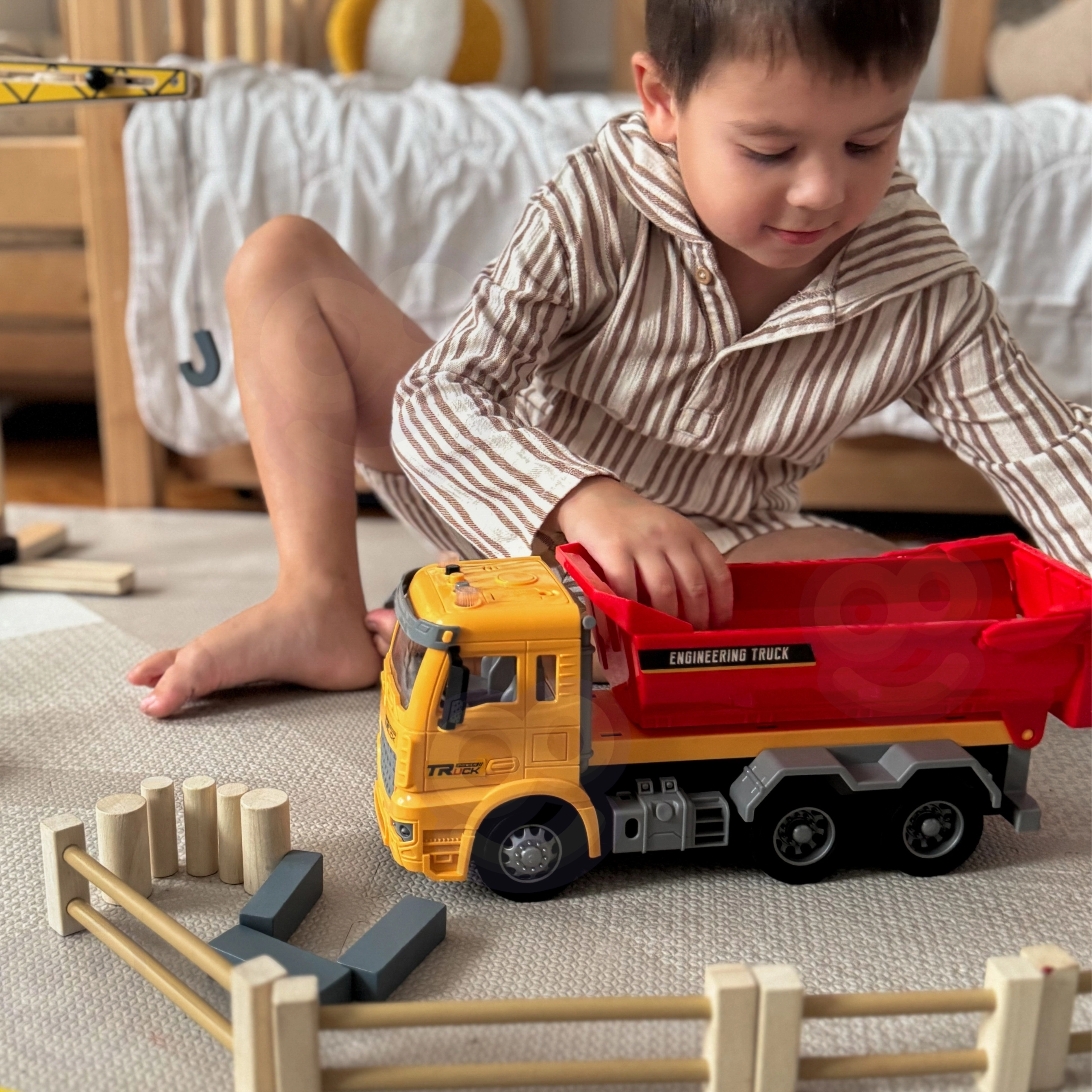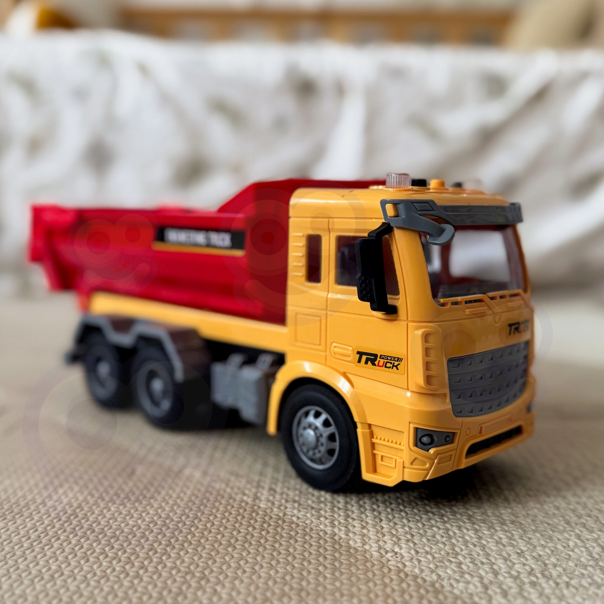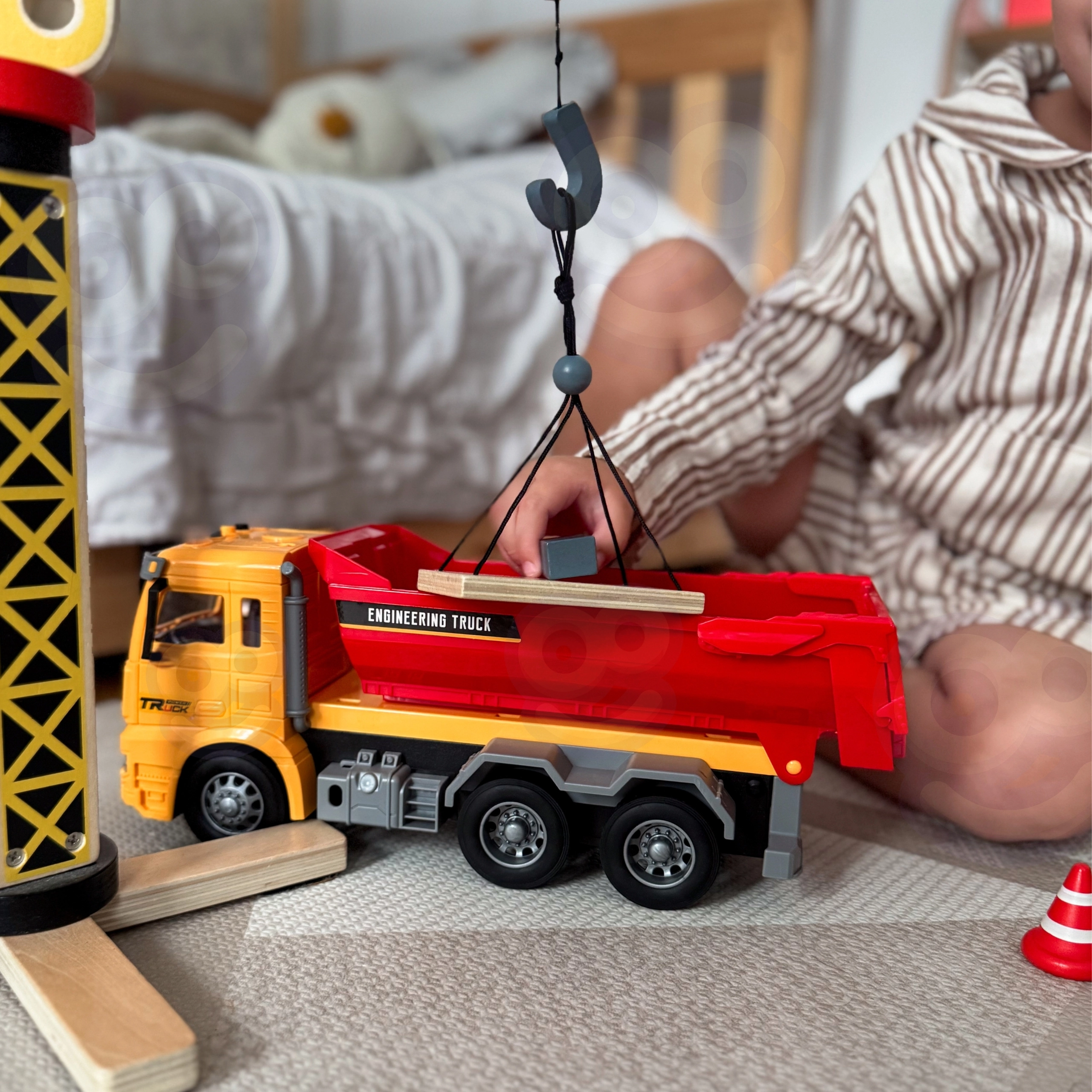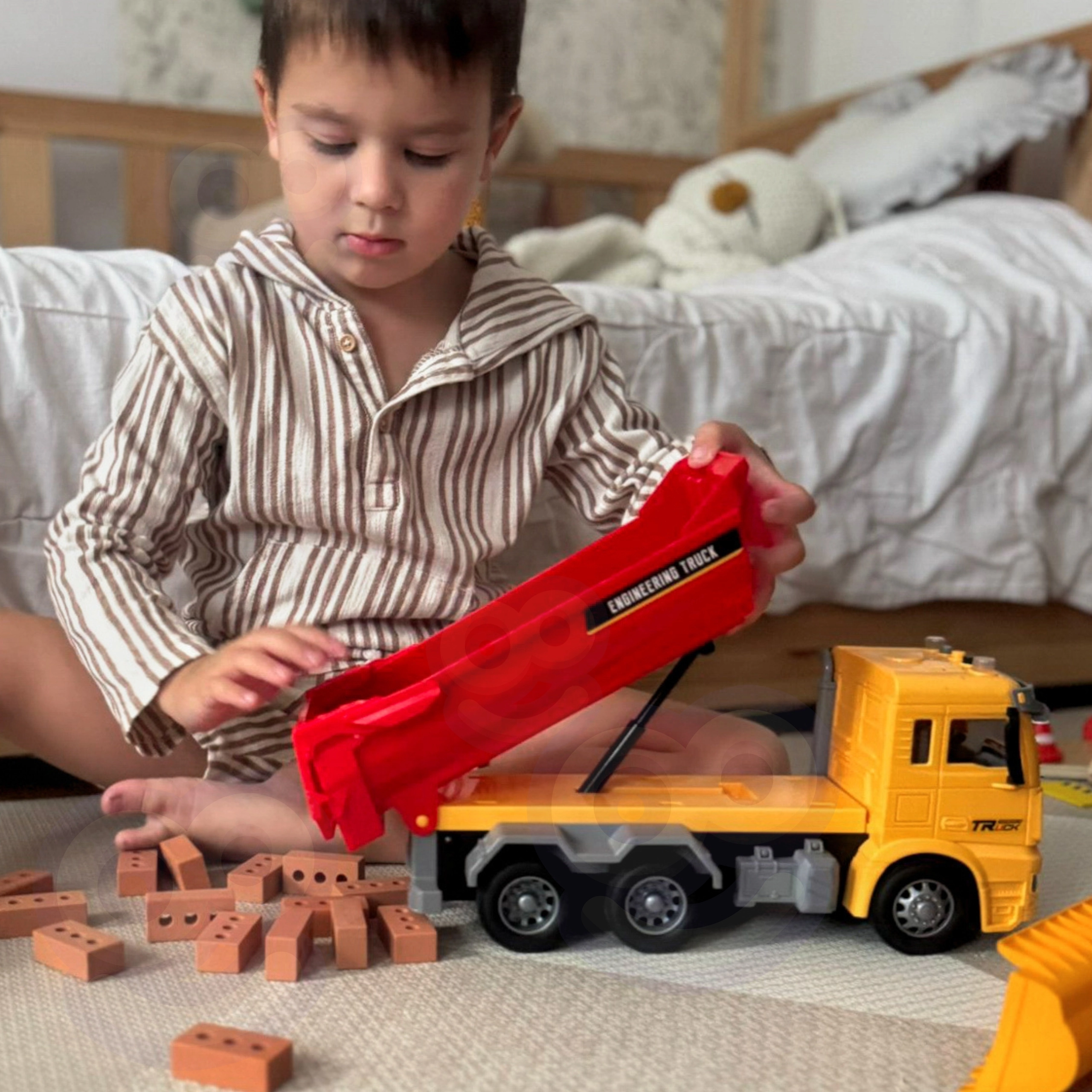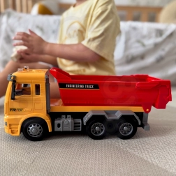 Tato detailně zpracovaná dětská sklápěčka přináší autentický zážitek z „pracoviště“ přímo do dětského pokoje. Díky funkční výklopné korbě mohou děti nakládat, převážet a vysypávat kostky či jiné drobnosti, zatímco světla na střeše kabiny a realistické zvuky podpoří hraní rolí malých inženýrů a stavitelů.