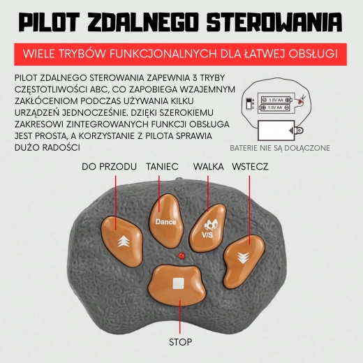 - K provozu dinosaura a ovladače je potřeba 5 x 1.5V AA baterií (není součástí balení).