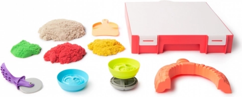 - 450 g kinetického písku ve 4 barvách, 2 lisy, 3 nástroje, krabice/herní plocha