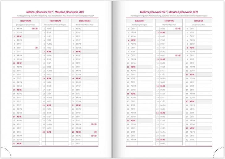 - Plánovací kalendáře: Obsahuje měsíční plánovací kalendář pro roky 2026 a 2027 a roční plánovací kalendář 2026–2027.