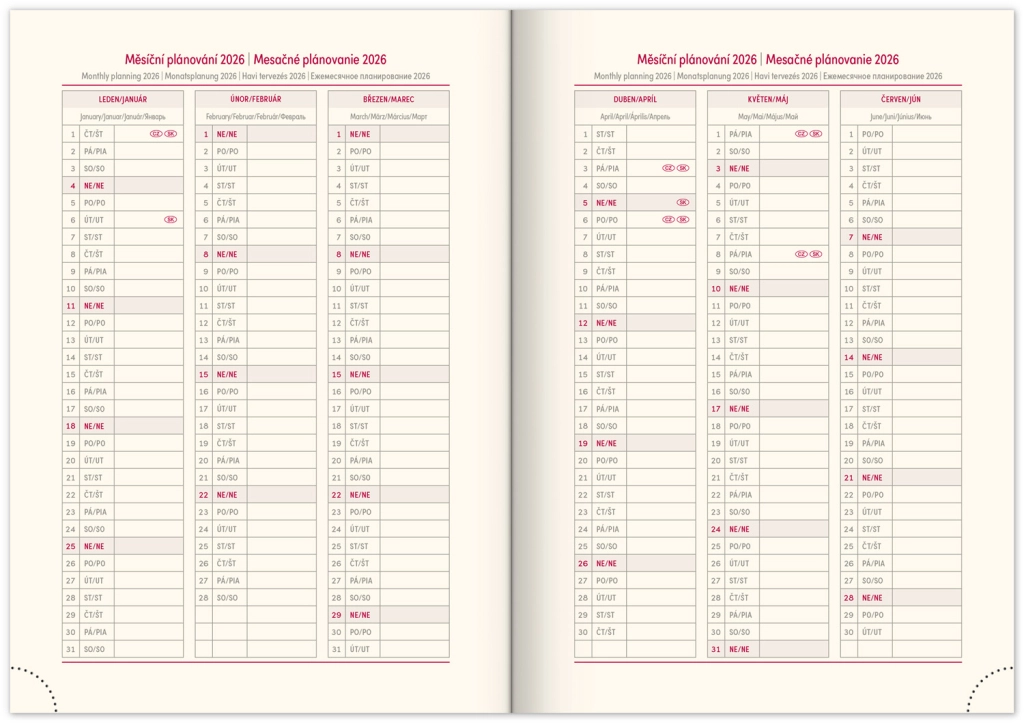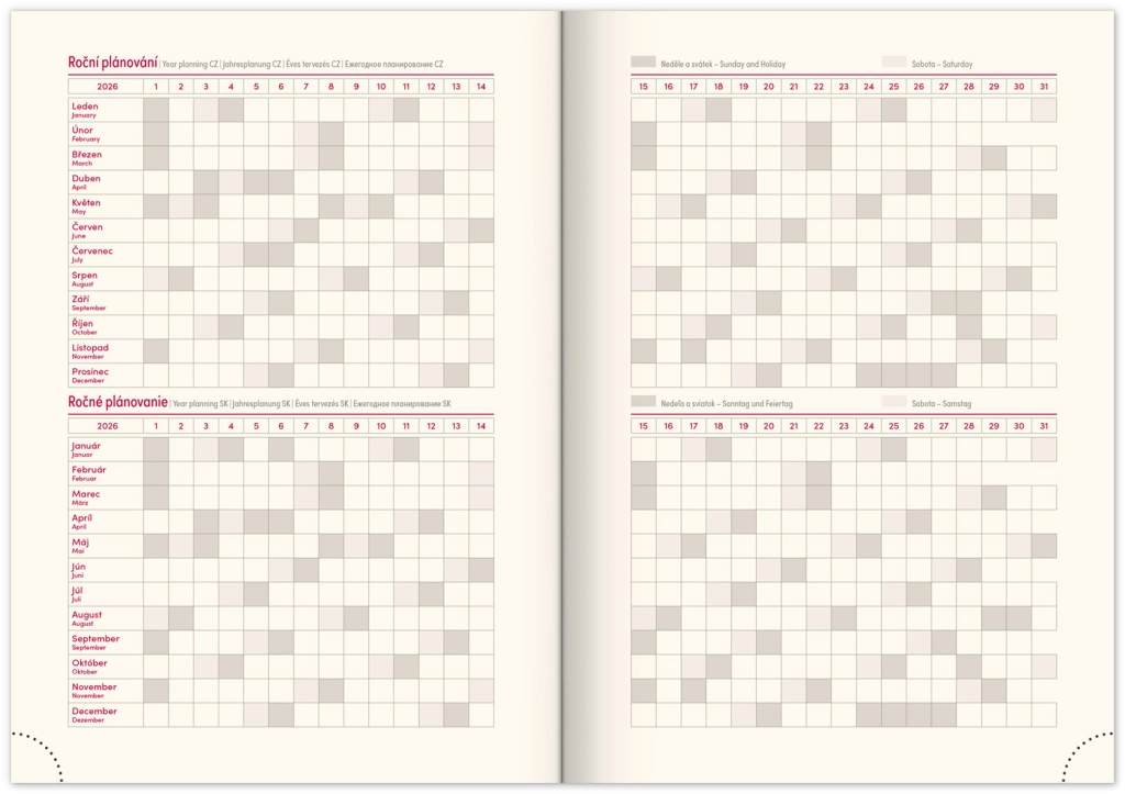 - Měsíční a roční plánovací kalendáře pro rok 2026 a 2027