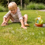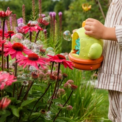 Hračku doplňují barevná světýlka a zvukové efekty, které ještě víc vtáhnou do hry a podpoří fantazii. Uzavíratelná nádobka brání rozlití roztoku a díky pohodlnému držadlu si děti bublifuk snadno vezmou na zahradu, na hřiště nebo k prarodičům.