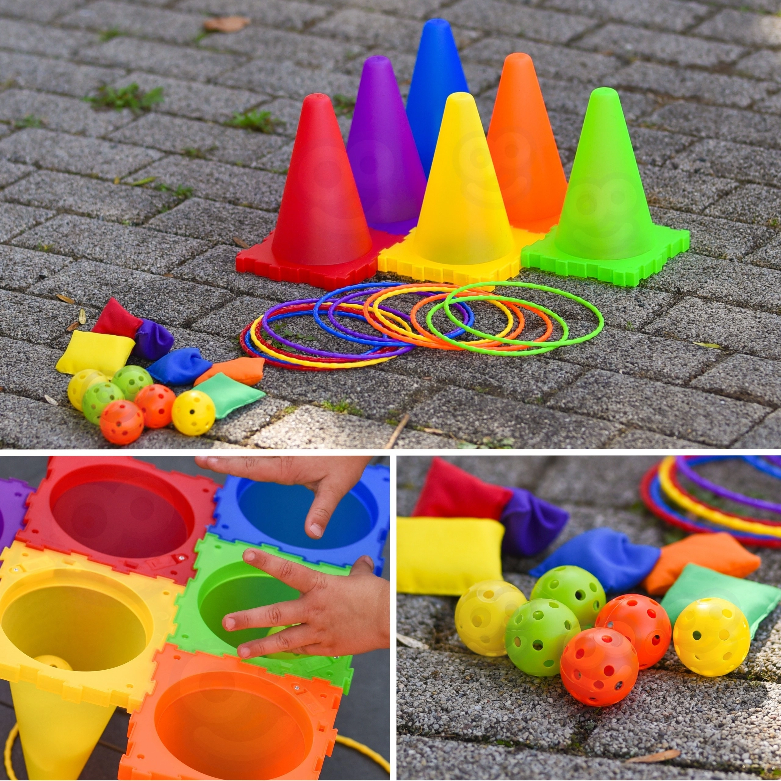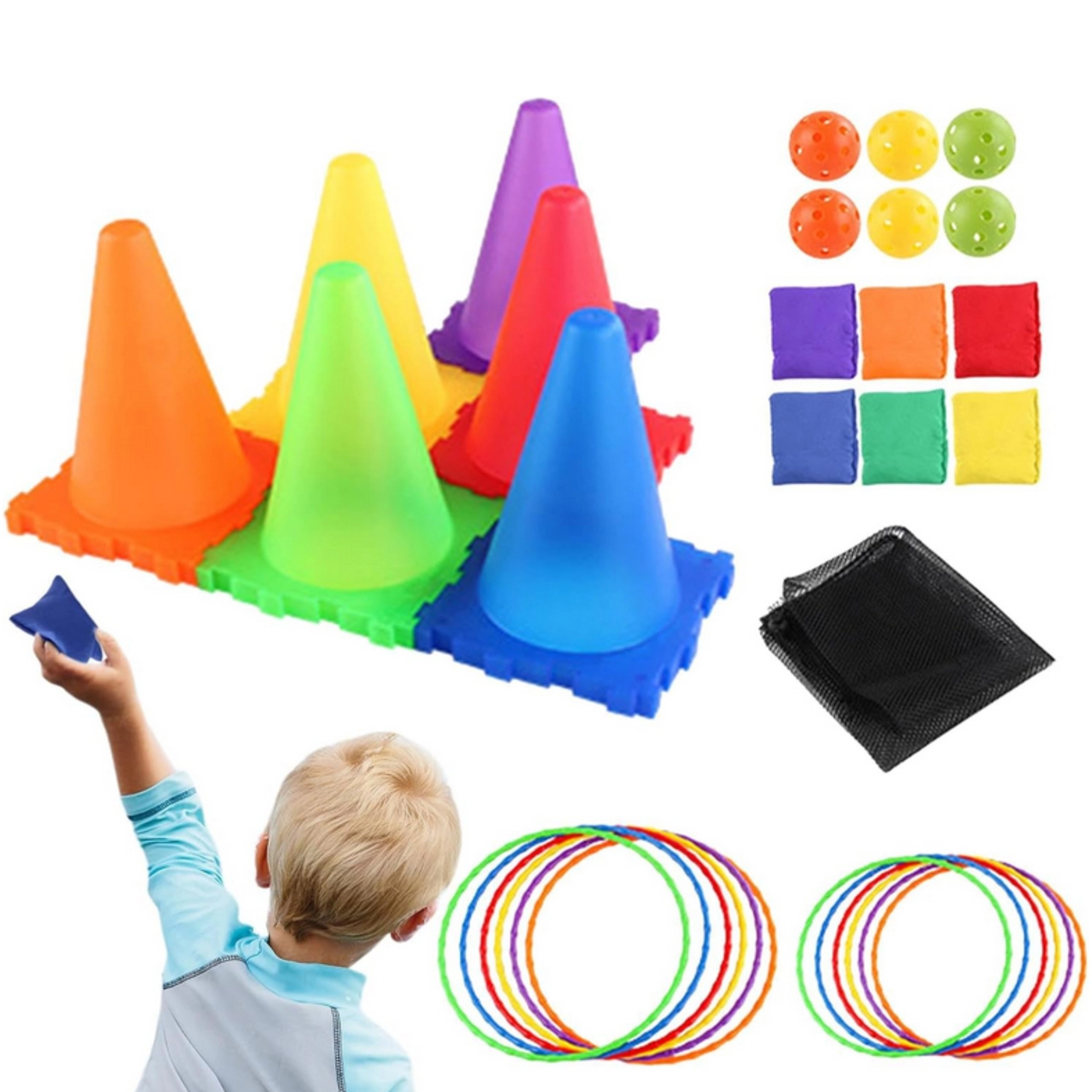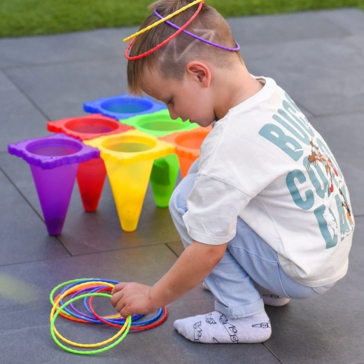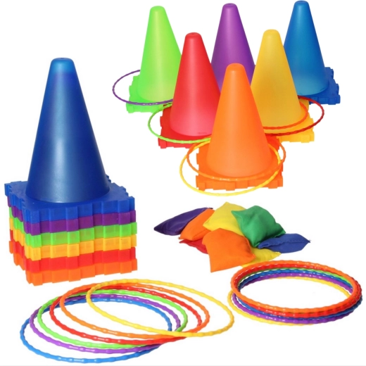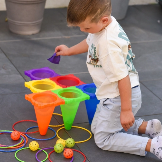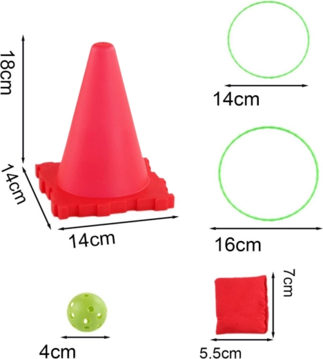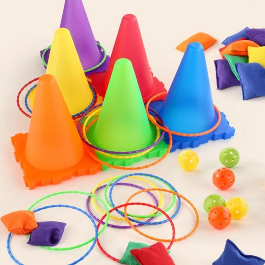V sadě najdete vše pro tři oblíbené hry: toss míčků do kuželů, bean bag toss do cílů a ring toss na kužely. Díky lehké a bezpečné konstrukci se hodí pro venkovní i vnitřní použití. Jasné barvy zvyšují viditelnost a motivují k pohybu.