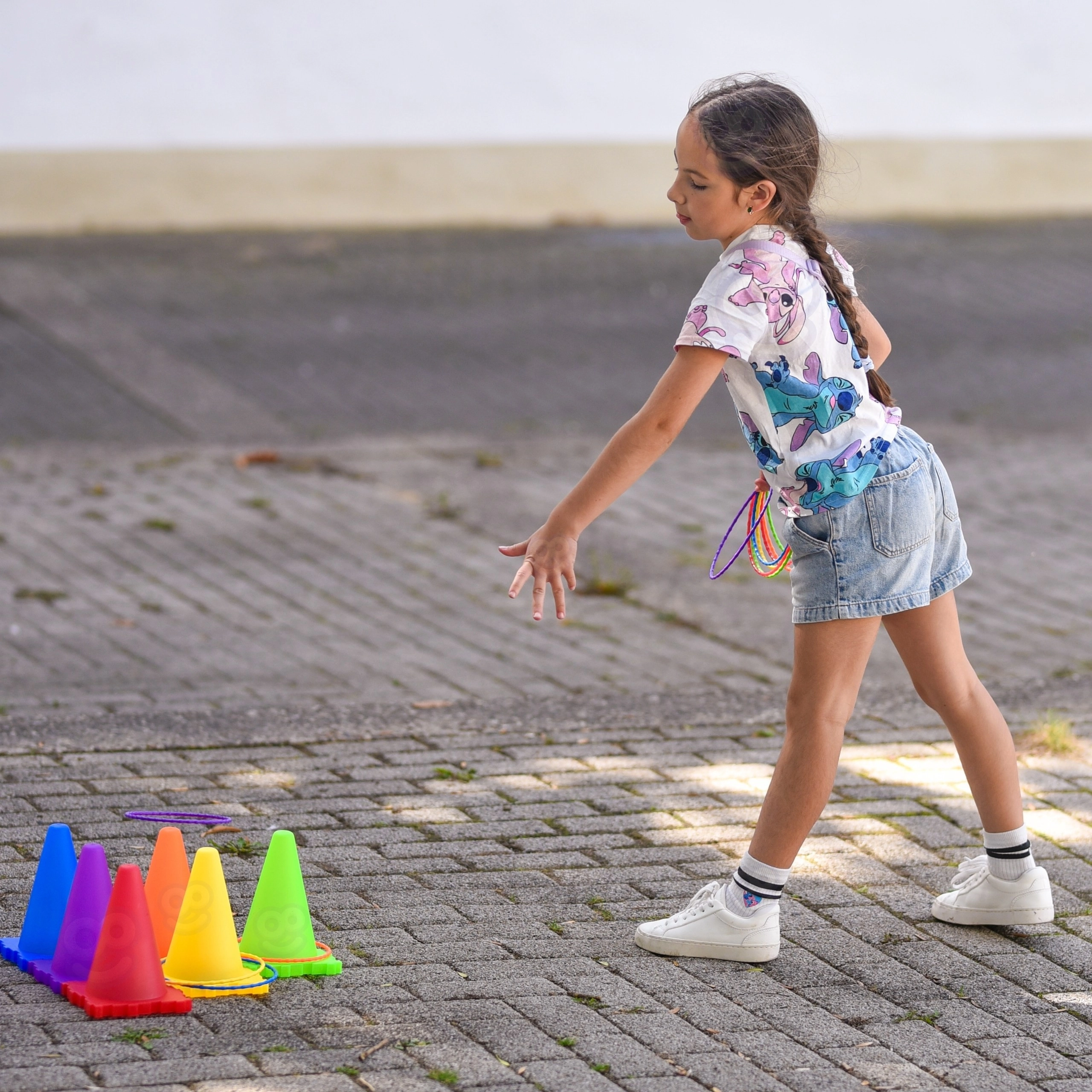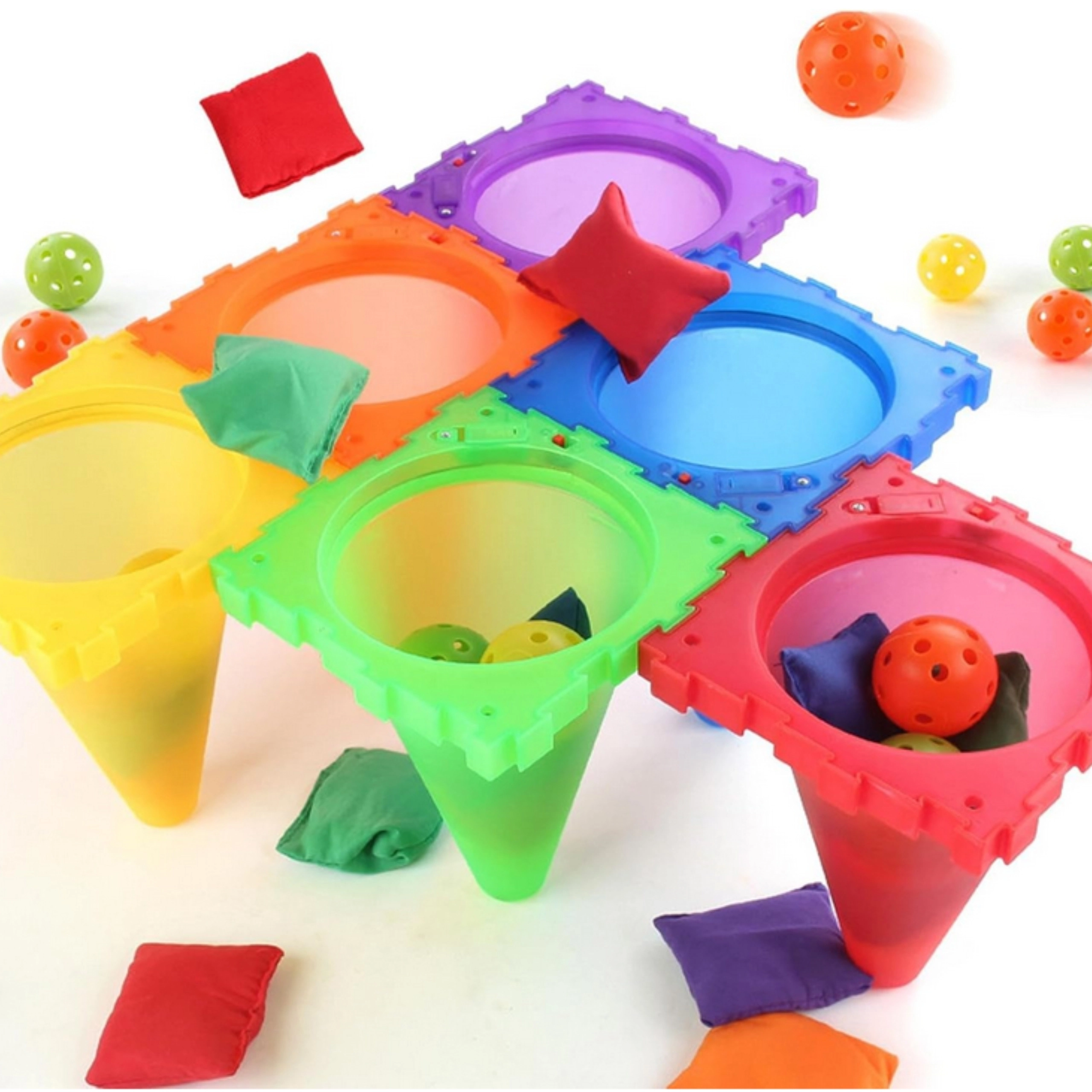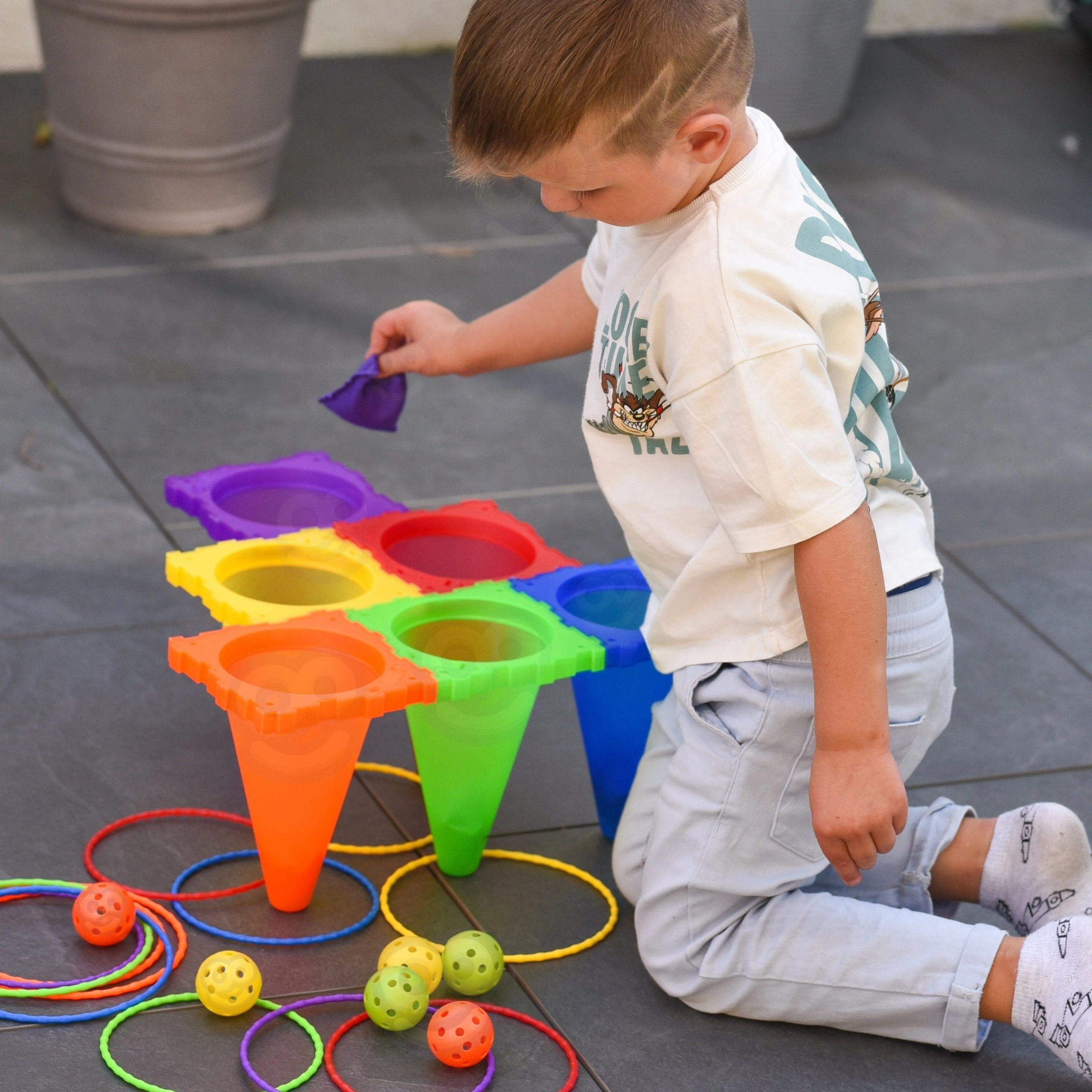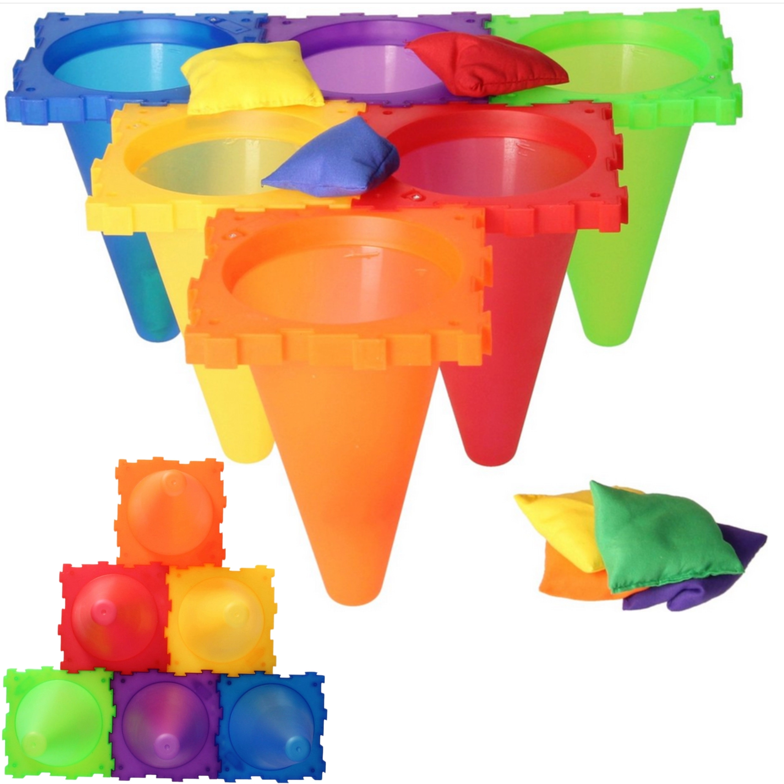 V sadě najdete vše pro tři oblíbené hry: toss míčků do kuželů, bean bag toss do cílů a ring toss na kužely. Díky lehké a bezpečné konstrukci se hodí pro venkovní i vnitřní použití. Jasné barvy zvyšují viditelnost a motivují k pohybu.