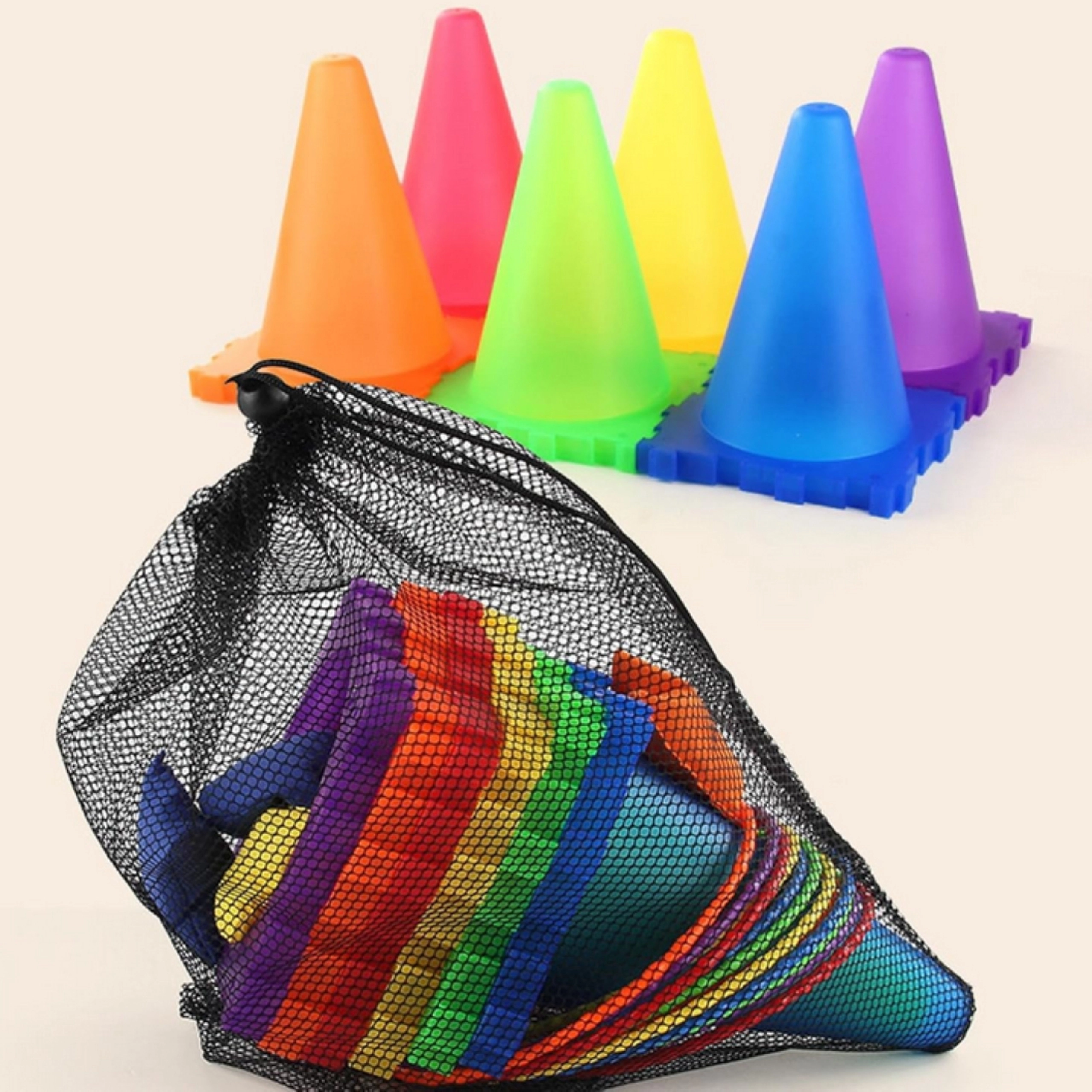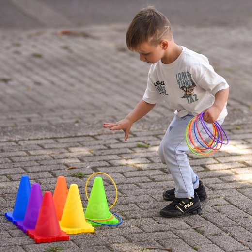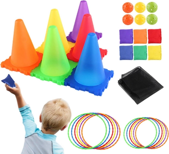 Jasně barevné plastové kužely, perforované míčky a měkké sáčky jsou vhodné pro děti, snadno se přenášejí a vydrží časté používání venku i doma.