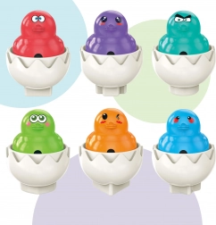 Hrací vajíčka od značky Woopie zavádějí vaše dítě do světa plného barev, tvarů a veselých tváří. Každé z šesti roztomilých vajíček ukrývá barevné kuřátko s legračním výrazem a při stlačení vydává zvukový efekt. Cílem je nejen seskládat správnou skořápku, ale také umístit ji na správné místo v zásobníku.