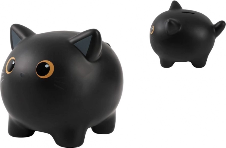Pokladnička ve tvaru černé kočky, vyrobená z odolného PVC, je ideální pro děti k dlouhodobému ukládání úspor.