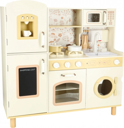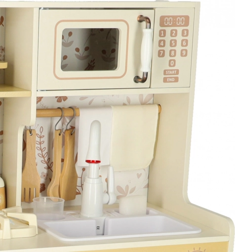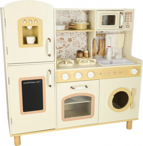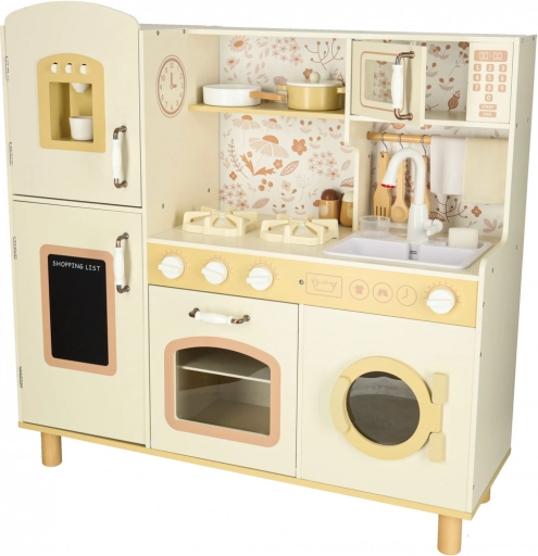 V sestavě najdete vše pro hraní rolí: troubu s policí, mikrovlnku, lednici s tabulí na křídu (nákupní seznam), dřez s funkčním kohoutkem, pračku, otevřené i uzavřené úložné prostory a háčky na náčiní. Doplňky jako hrnec s poklicí, pánev, špachtle, solnička a pepřenka, hrnek, houbička a utěrka dělají z hraní realistický zážitek.