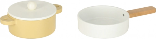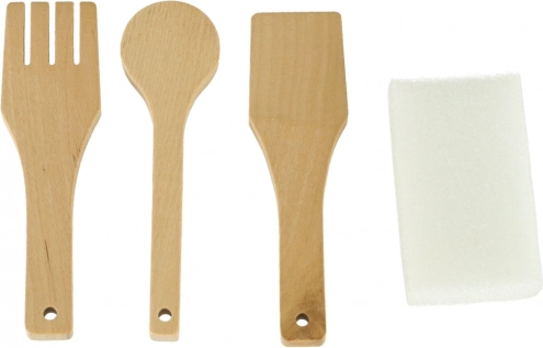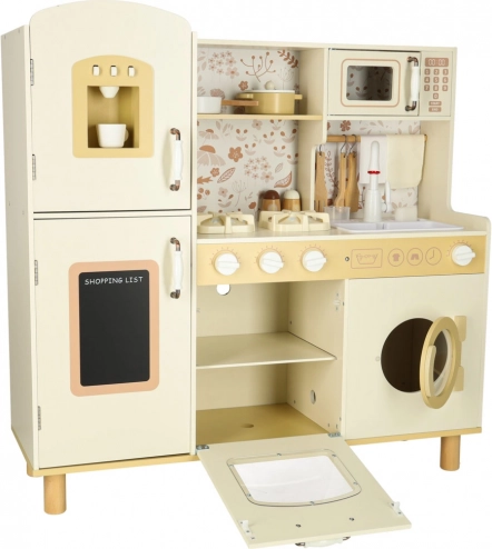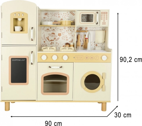 Trouba, mikrovlnka, lednice, pračka a skříňky s policemi doplňuje hrnec, pánev, špachtle, hrnek, solnička a pepřenka pro plnohodnotnou hru rolí.