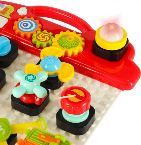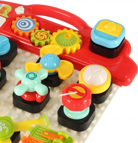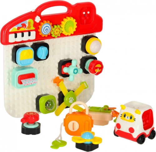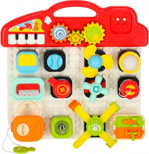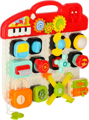 Interaktivní edukační smyslová hračka je navržena tak, aby podporovala učení dětí skrze hru. Tato skládací manipulativní tabule nabídne nepřeberné množství interaktivních prvků:
